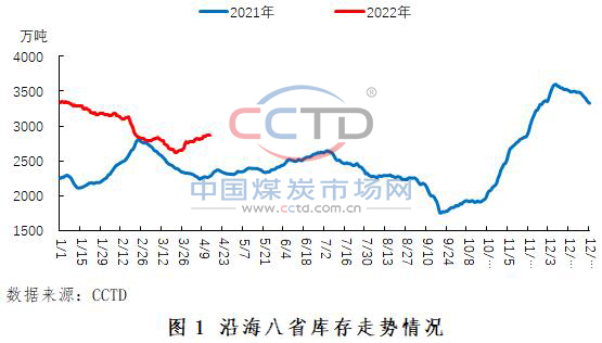 近期終端庫存持續(xù)增加。3月下旬以來,受疫情形勢嚴峻、季節(jié)性淡季等因素影響,終端日耗低位,庫存水平持續(xù)提升。根據(jù)CCTD中國煤炭市場網(wǎng)監(jiān)測的數(shù)據(jù)顯示,截至4月15日,沿海八省煤炭庫存已增至接近2900萬噸,較3月下旬最低點增加250多萬噸,較去年同期增加570多萬噸。