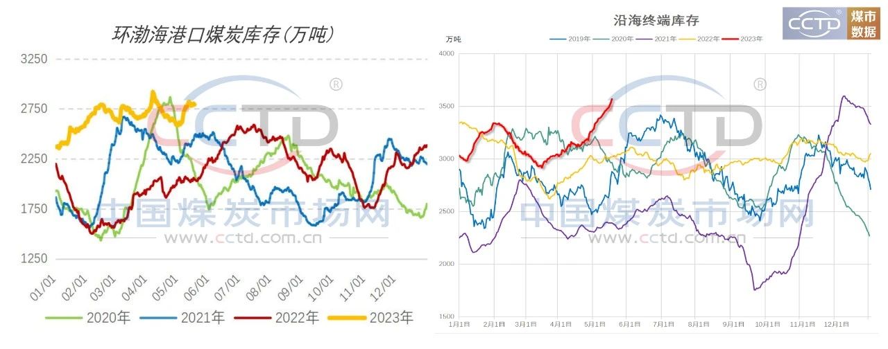 一是中下游環(huán)節(jié)庫存持續(xù)積累,沿海市場壓力較大。受進(jìn)口煤明顯增量沖擊,北上內(nèi)貿(mào)煤采購需求持續(xù)偏弱,環(huán)渤海港口煤炭庫存再度積累至2800萬噸高位水平。同時沿海終端庫存也在持續(xù)攀升,并接近歷史峰值水平。迎峰度夏前終端接貨力度有限,港口環(huán)節(jié)疏港壓力明顯增加,市場供需形勢繼續(xù)向?qū)捤裳莼?,后期沿海市場煤仍面臨較大壓力。