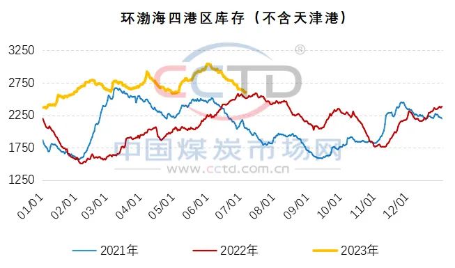 6月份鐵路發(fā)運(yùn)倒掛進(jìn)一步擴(kuò)大,貿(mào)易商請(qǐng)車發(fā)運(yùn)意愿偏低,僅長(zhǎng)協(xié)戶及少量大戶維持發(fā)運(yùn),而南方地區(qū)受降雨影響氣溫雖有起伏,使得沿海電廠日耗稍有回落,但整體仍高。且正值迎峰度夏階段,后續(xù)高溫天氣還將持續(xù),為滿足自身剛需,終端長(zhǎng)協(xié)兌現(xiàn)率較為穩(wěn)定,加上部分市場(chǎng)煤采購(gòu)需求釋放,部分優(yōu)質(zhì)貨源顯得更加稀缺。截至7月6號(hào),環(huán)渤海四港區(qū)(不含天津港)總庫(kù)存2606.6萬(wàn)噸,月環(huán)比減少350.7萬(wàn)噸,同比增加93萬(wàn)噸。