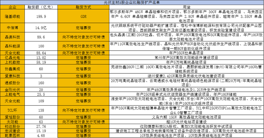 從募資節(jié)奏來看,幾大龍頭步幅明顯大于二三線企業(yè),其中隆基、TCL中環(huán)、晶澳、晶科、天合光能在上半年再次聚攏百億資金,繼續(xù)擴產(chǎn)。