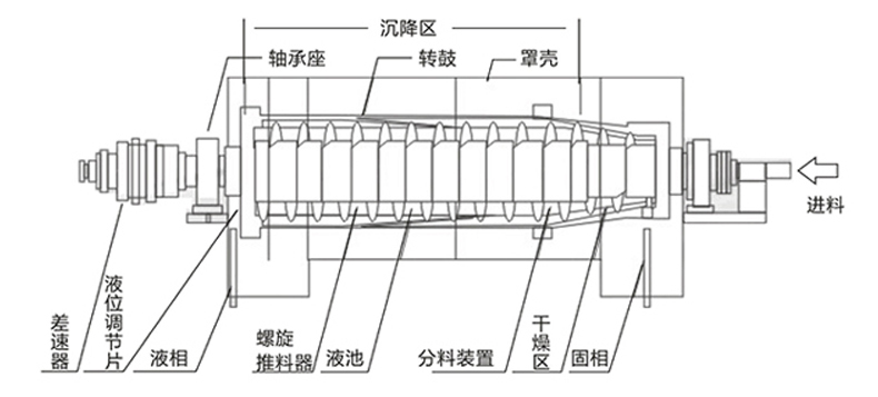 臥螺離心機(jī)是一種臥式螺旋卸料、連續(xù)操作的沉降設(shè)備。本類(lèi)離心機(jī)工作原理為:轉(zhuǎn)鼓與螺旋以一定差速同向高速旋轉(zhuǎn),物料由進(jìn)料管連續(xù)引入輸料螺旋內(nèi)筒,加速后進(jìn)入轉(zhuǎn)鼓,在離心力場(chǎng)作用下,較重的固相物沉積在轉(zhuǎn)鼓壁上形成沉渣層。輸料螺旋將沉積的固相物連續(xù)不斷地經(jīng)過(guò)轉(zhuǎn)鼓小端的干燥區(qū)進(jìn)一步脫水后經(jīng)排渣口排出機(jī)外。較輕的液相物則形成內(nèi)層液環(huán),由轉(zhuǎn)鼓大端溢流口連續(xù)溢出轉(zhuǎn)鼓,經(jīng)排液口排出機(jī)外。